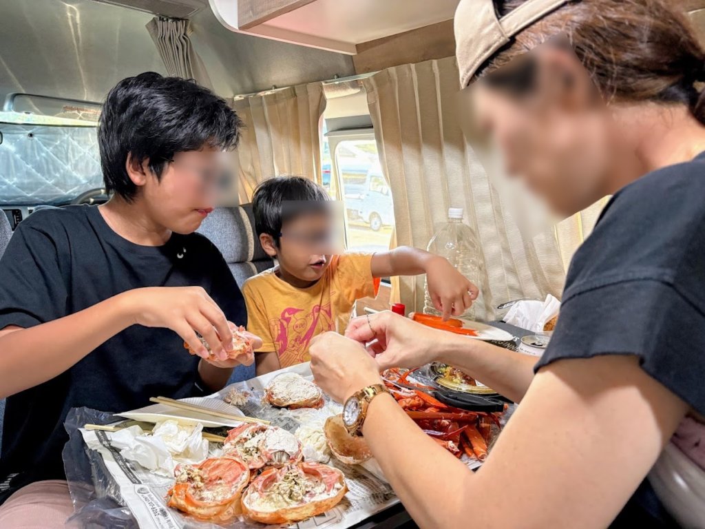 カニを手に入れた後は、「道の駅 うみてらす名立」へ。ここで車中泊をすることにしました。夕日がとにかく幻想的で、日本海沿いならではの絶景。新潟を好きな理由の一つかも。さて、寝床を確保したので、かにや横丁で仕入れたカニで宴を開始。3杯あっても家族全員で食べたら瞬殺ですwベニズワイガニ、ジューシーで美味しゅうございました。