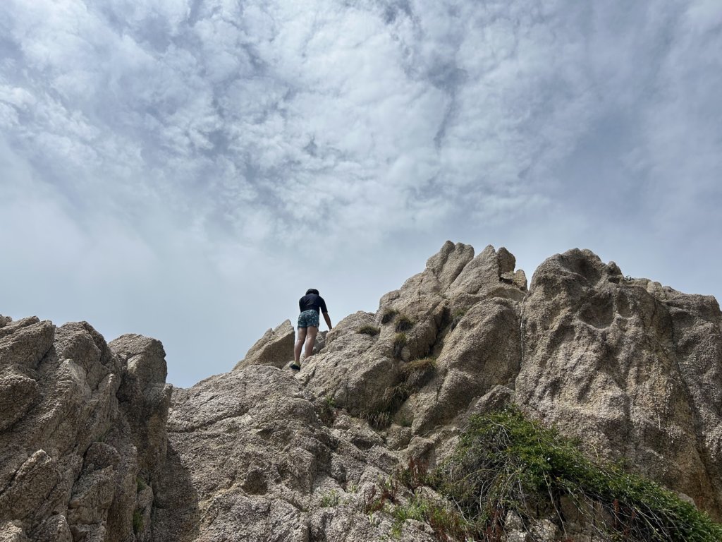 浜辺にはゴツゴツとした岩場も多く、岩に登ったり、隙間をのぞいたりと、子どもたちは探検気分。